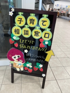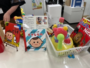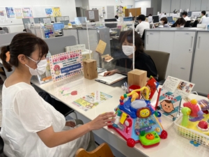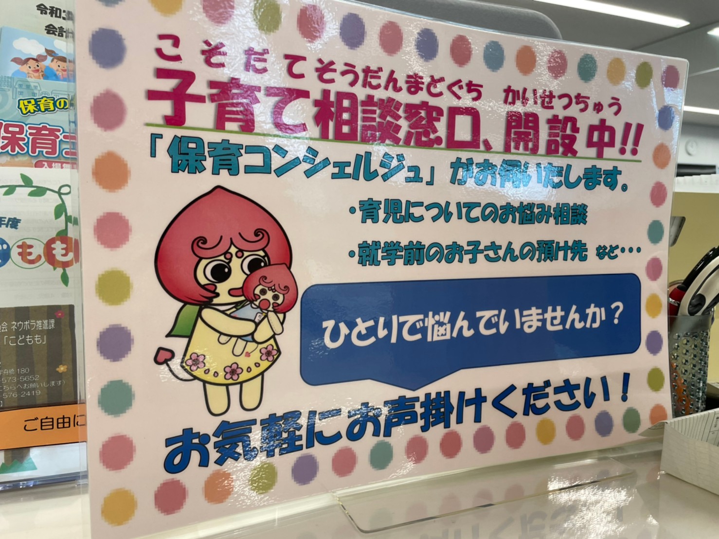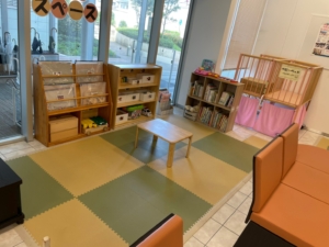 保育コンシェルジュはこども未来課に勤務しており、相談窓口にはおもちゃが置いてあり、相談窓口近くには遊び場スペースと、小さいお子さんが一緒に来ても飽きない工夫がされていました。近くに授乳場所もあり、授乳やおむつ替えなど、いざという時でも安心して利用できます。