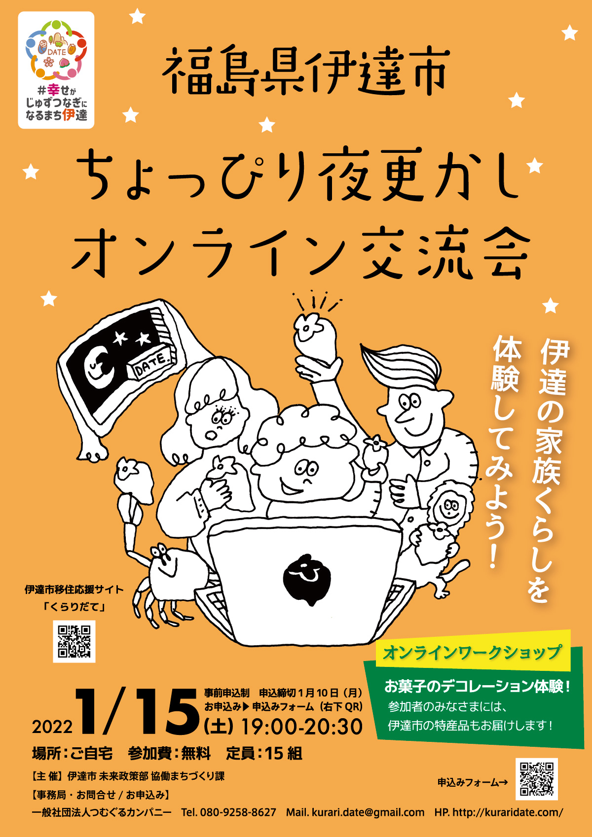 2022.1/15(土)オンライン交流会を開催いたします!こんにちは、伊達市移住コンシェルジュのヒロコです。お知らせです!来年1/15(土) 19:00~20:30 でオンライン交流会を開催いたします!→12/28定員になりましたので、募集を締め切らせていただきます。 イベントを開催する時間帯、とても悩みました。普通だ...