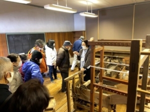 今回のツアーの開始となった、霊山町泉原地区にある泉原養蚕用具展示室。近隣で収集した貴重な養蚕関係の用具を何年もかけ収集・整理し、旧泉原小学校の教室に整然と展示しています。収集点数は約5000点。これだけ養蚕関連用具を集めた施設は全国でも珍しく当収集物は平成31年に国の重要有形民俗文化財に指定されました。当館では代表の丹治純子さんより、当地における養蚕・絹産業の歴史と特徴をご説明頂き、その後施設内の養蚕関連用具群を見学しました。見学者の中には元養蚕農家だった方もおられ展示用具に大変懐かしがっておられました。