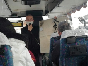 養蚕展示室見学の後は、かつて「掛田折り返し糸」として名をはせた霊山町の中心地である掛田の町をバス散策しました。かつて掛田は生糸の生産・流通の拠点としておおいに繁栄した時期もあったと聞いています。今でこそ掛田の町はシャッター街の寂しい町となってしまいましたが、往時の名残の跡を確認する事ができました。説明者は地元掛田で「りょうぜん天蚕の会」を主宰する八島利幸さん。掛田の町の歴史と養蚕・絹に関する八島先生のとめどなく湧いてくる知識と名調子は名人芸の域です。
