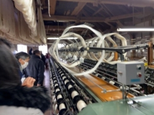 りょうぜん道の駅で昼食後、バスは南下し機織りの町川俣町へ到着しました。道の駅川俣に隣接する「川俣おりもの展示館」を見学した後は、今回のツアーの楽しみのひとつであった現役の機織り工場である「齋栄織物」様を訪問し工場見学をさせて頂きました。先述のように川俣は「羽二重」という薄い絹織物の生産が盛んな地域で、町のあちらこちらの機屋から“カタンカタン”と軽快な音が響いていたようです。ただこちらも時代に波には逆らえず、かつて240軒を数えた機屋は今では1けたまで減ってしまいました。ただ、その羽二重生産で培った先人の技術は現在新しい世代にしっかり受け継がれ、更なる研鑽を続けています。ここ齋栄織物様は“世界でもっとも薄い絹織物(フェザーシルク)を作る工場として英国王室御用達の素晴らしい織物を世に送りだしています。今回はそちらの貴重な工場の見学をさせてもらいました。