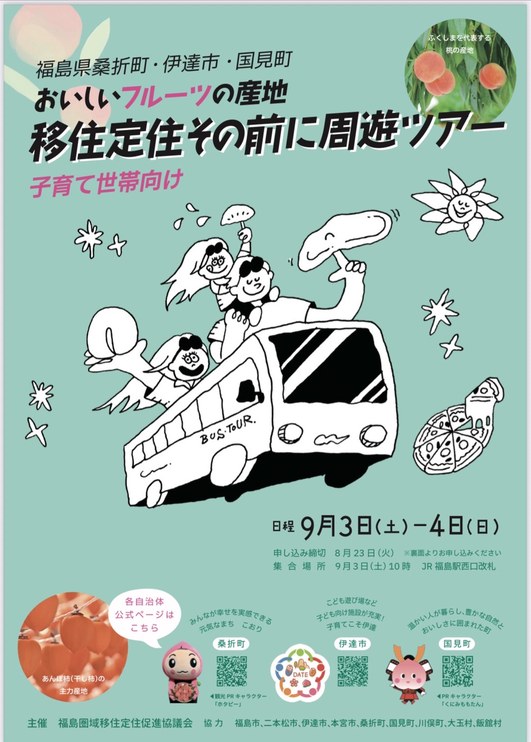 こんにちは、移住コンシェルジュのヒロコです。おいしいフルーツの産地を周遊する、移住体験ツアーを開催いたします!伊達市とお隣の桑折町・国見町を回ります。伊達市では地元の宿泊施設に泊まり、生活環境を見学する予定です。桑折町ではピザ作り、国見... -