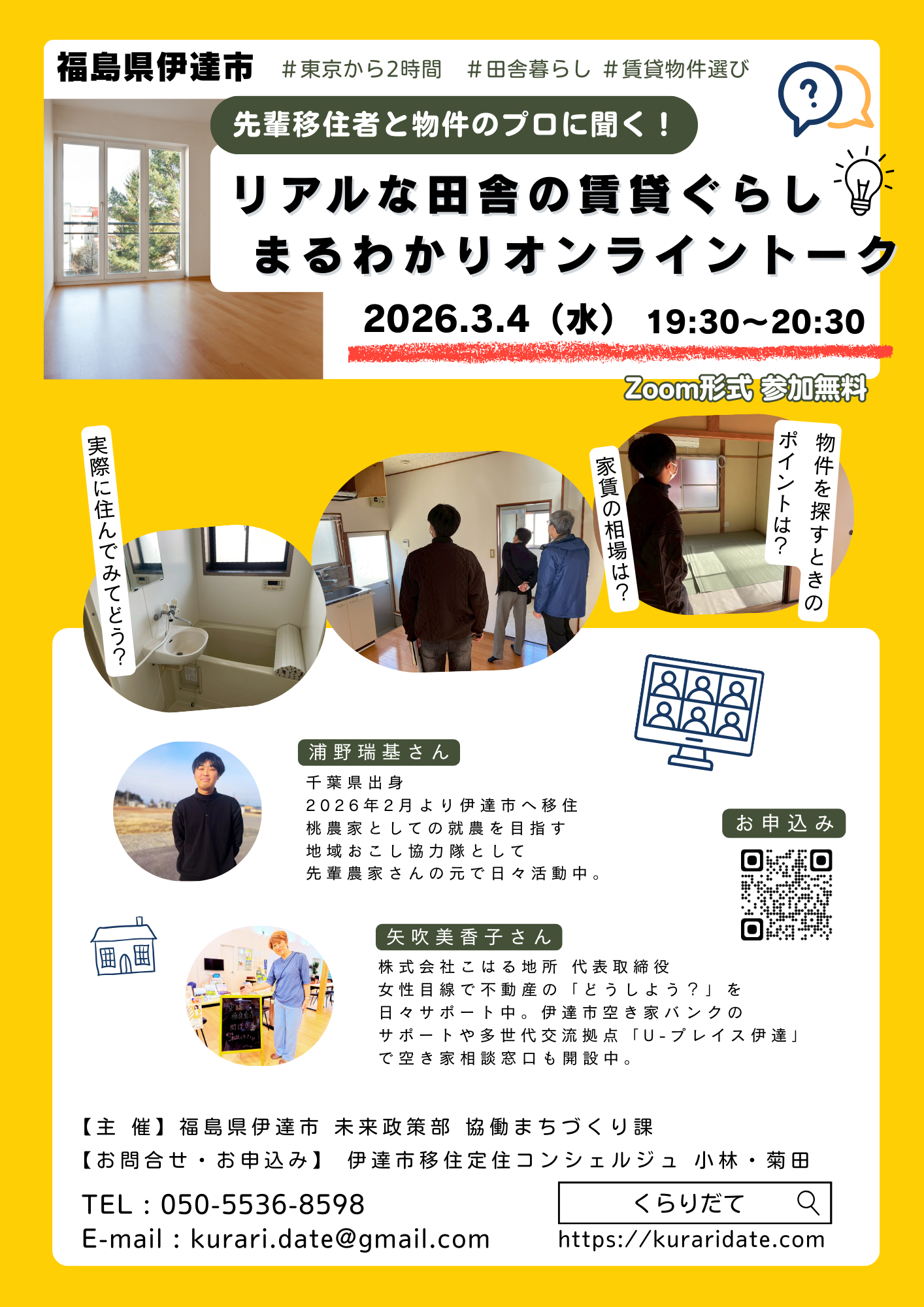 今年移住されたばかりで、物件探しの経験をして間もない先輩移住者と、物件のプロをゲストに迎え、“地方だからこそ”の賃貸物件探しのポイントや実際に暮らしてみての感想など、リアルな情報をお話しします。